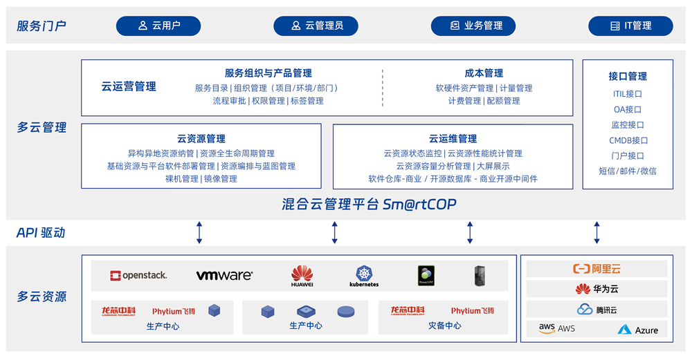 面向各行业用户多云资源管理、、、、运维及服务提供的综合挑战,,,,提供异构异地异芯片多云资源的统一管理、、、、统一运维、、、统一监控及统一运营服务,,,,简化多云管理复杂度,,,提升用户用云满意度,,,,释放云平台业务价值。。