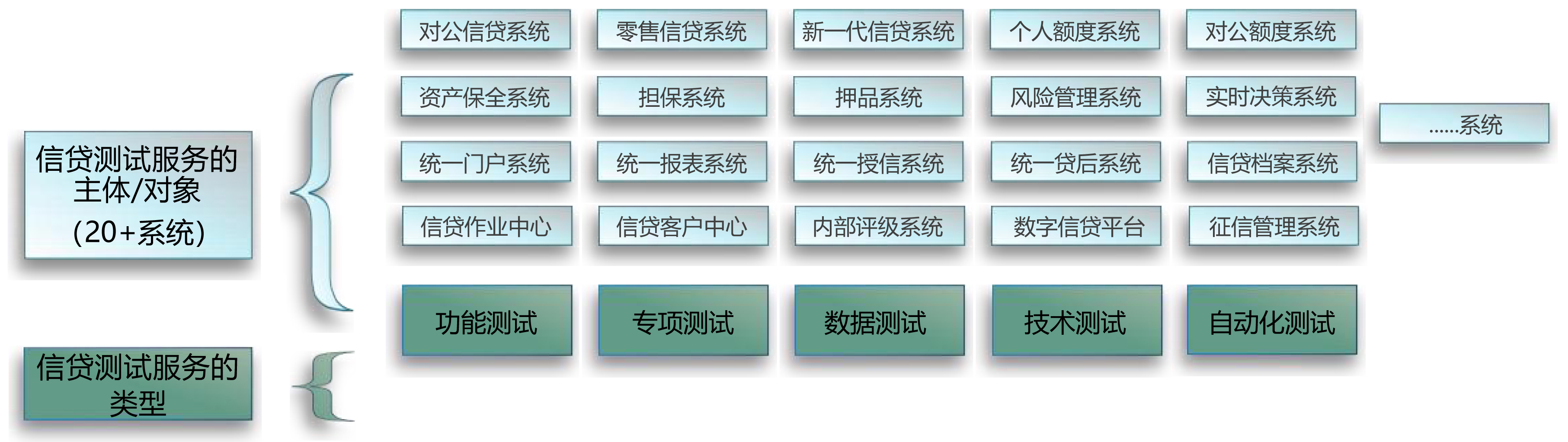 提供全面的测试服务,涵盖新信贷、、对公/零售信贷等20+信贷类系统,,,,以及功能、、性能、、数据、、自动化等类型测试。。。