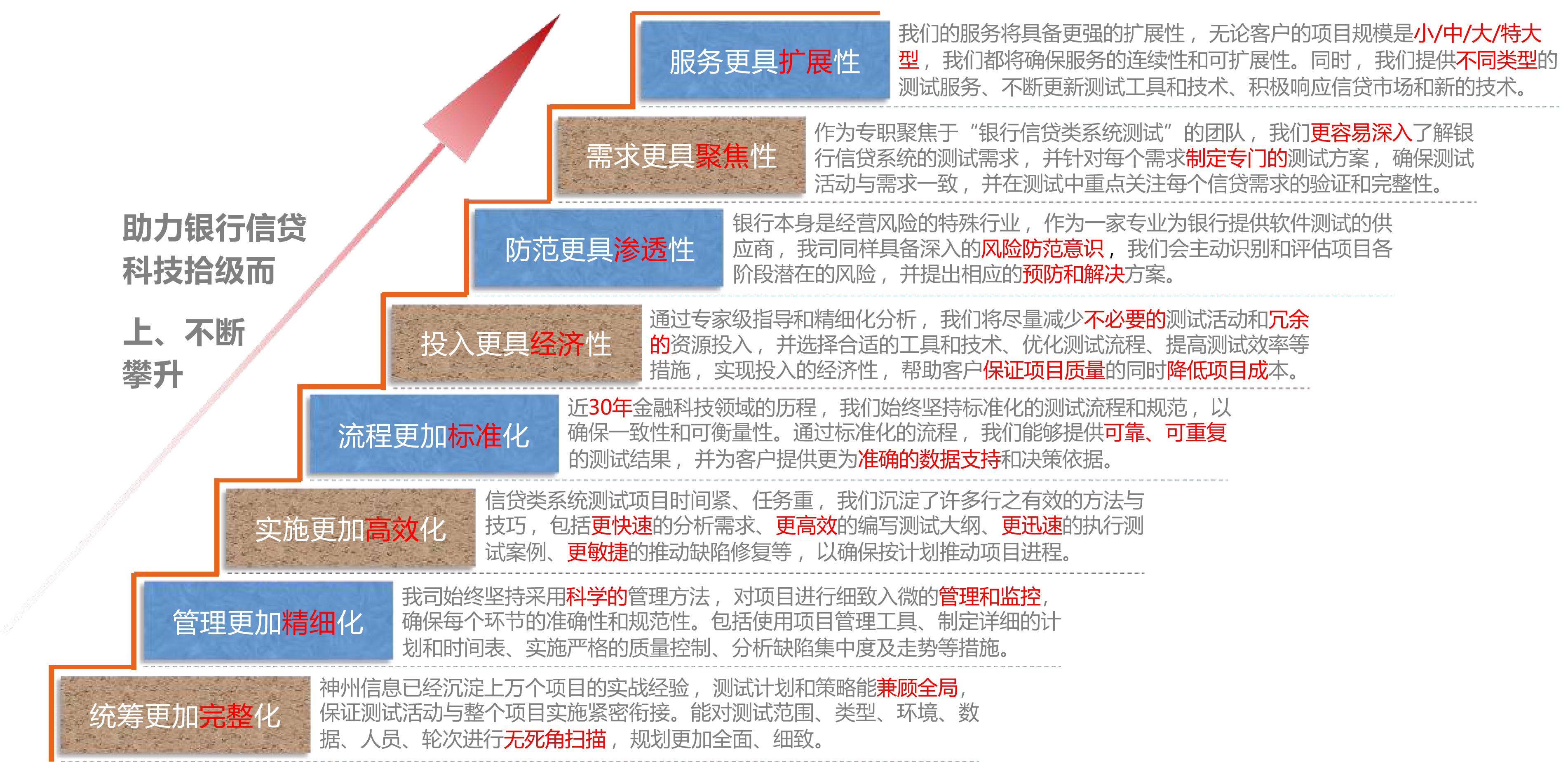 完善的测试管理体系,,,及优质、、全面的测试服务,,,以高标准监控项目实施各个阶段,,确保信贷类系统测试项目得以高质量的完成。。。